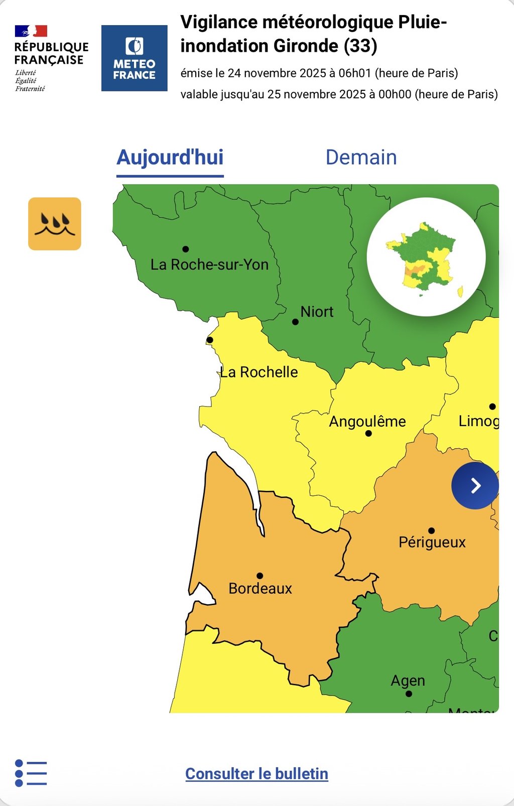 🟠🌧️Météo-France a placé la Gironde en vigilance orange pour risque de pluie-inondation, en raison d'un épisode pluvieux intense qui se poursuit sur le Sud-Ouest.
