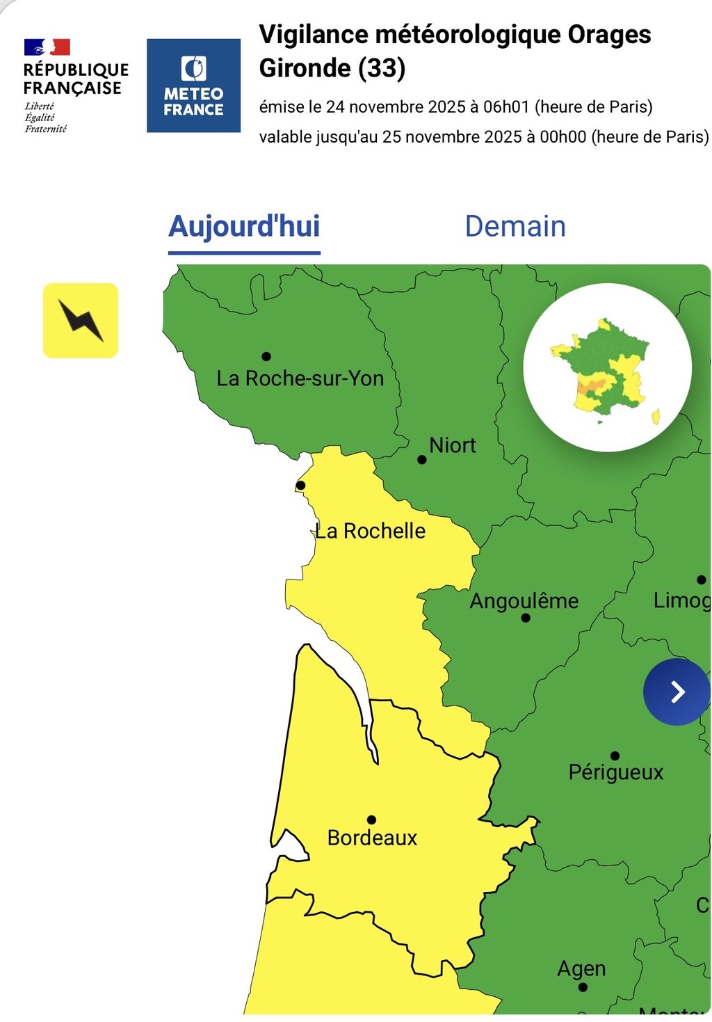 🟡⚡️ la Gironde est également placée en vigilance jaune pour le risque d'orages et vent.