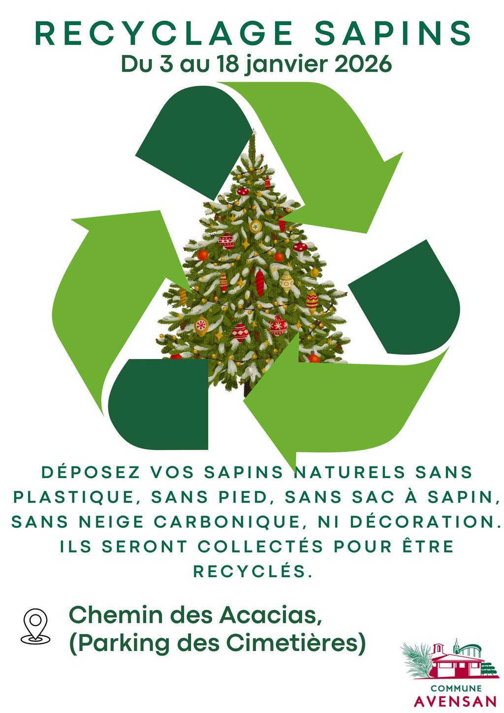⚠️ Rappel important : Pour que le broyage soit possible, merci de déposer des sapins naturels uniquement, sans décorations, sans neige artificielle et sans sac.