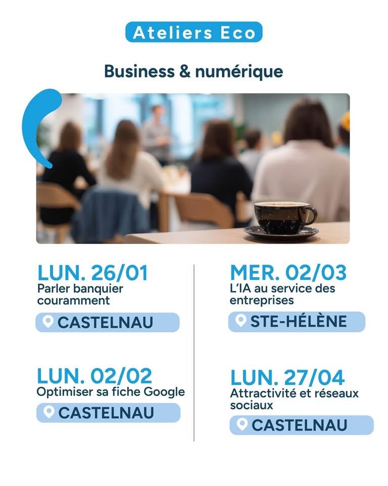 📣 Ateliers « Eco » en vue. En 2026, la Communauté de communes Médullienne poursuit son accompagnement des commerçants, artisans et TPE-PME avec un cycle d’ateliers gratuits dédiés au business et au numérique.