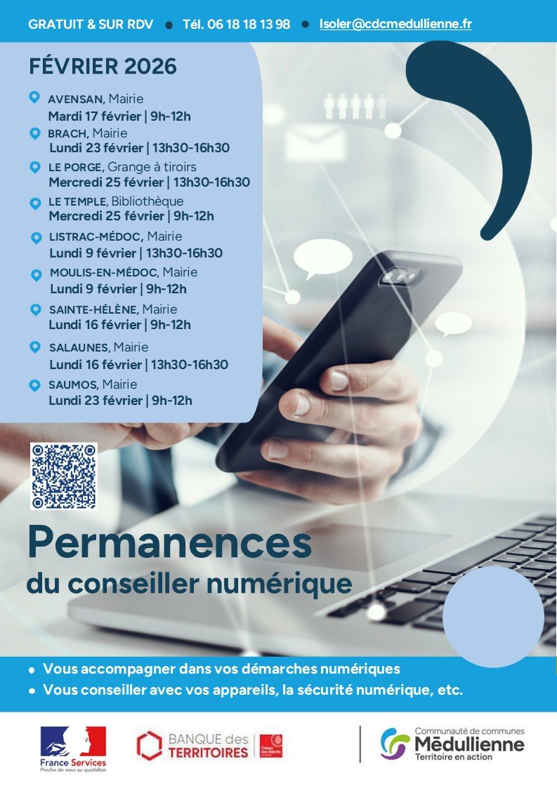 Dans le cadre de l'accompagnement des habitants aux usages du numĂ©rique, la CommunautĂ© de communes MĂ©dullienne a mis en place, Ă compter du mois de janvier, un nouveau fonctionnement des permanences du conseiller numĂ©rique.â