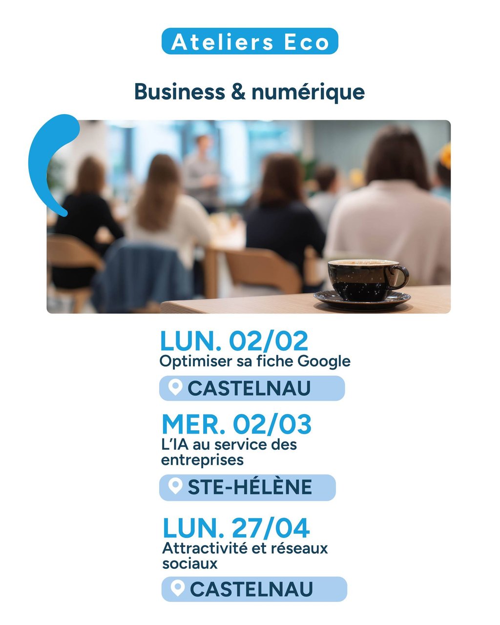 Le prochain rendez-vous arrive vite : Lundi 2 février à Castelnau pour apprendre à optimiser votre fiche Google. C'est l'outil indispensable pour que les clients vous trouvent en un clic !