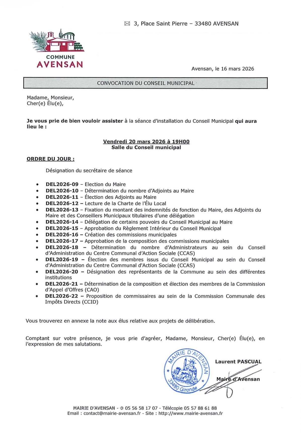 Nous vous informons que le Conseil Municipal dâinstallation se tiendra vendredi 20 mars 2026 Ă 19h00,