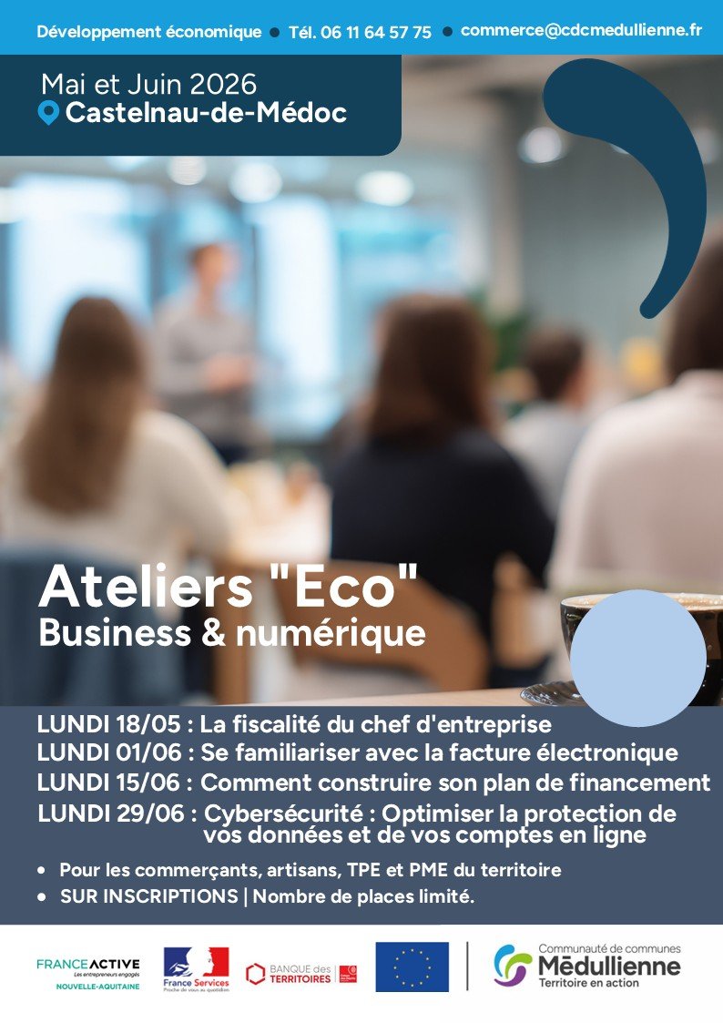Depuis début janvier 2026, la Communauté de communes Médullienne poursuit son accompagnement des commerçants, artisans et TPE-PME avec un cycle d’ateliers gratuits dédiés au business et au numérique. 📈