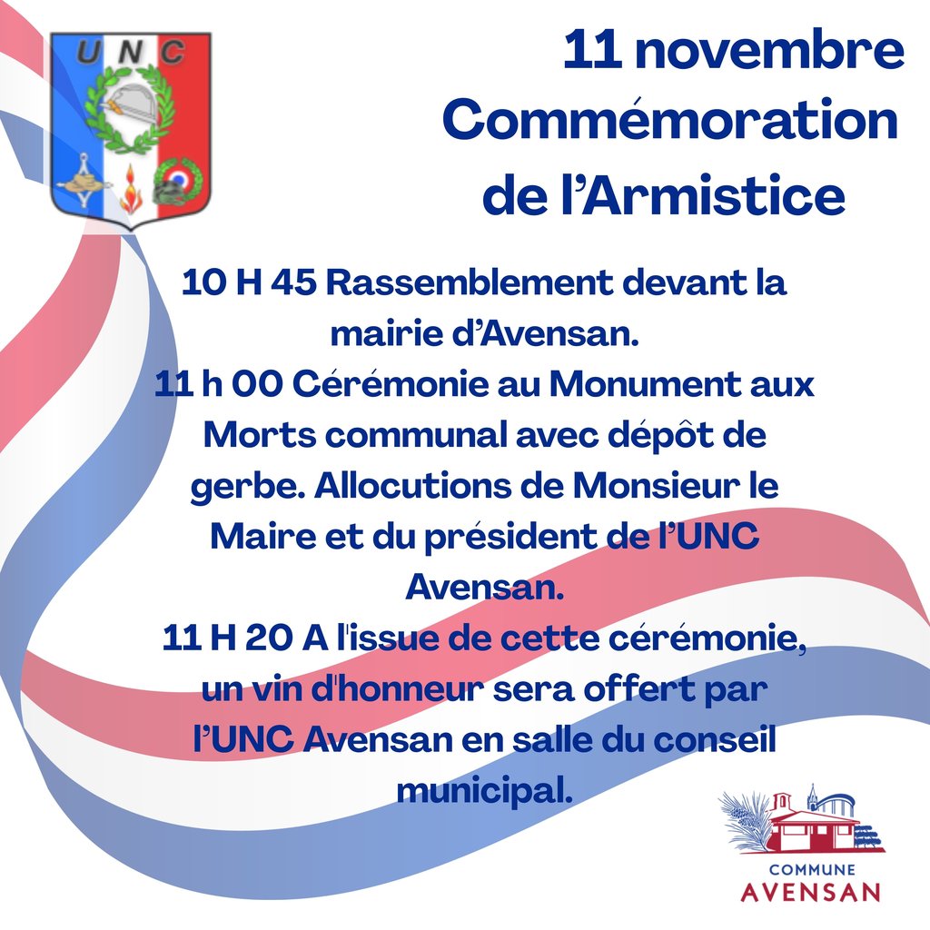 L'Union Nationale des Combattants (UNC) d'Avensan et la Municipalité vous invitent à la cérémonie commémorative du 107e anniversaire de l'Armistice du 11 novembre 1918, en hommage à tous les Morts pour la France.