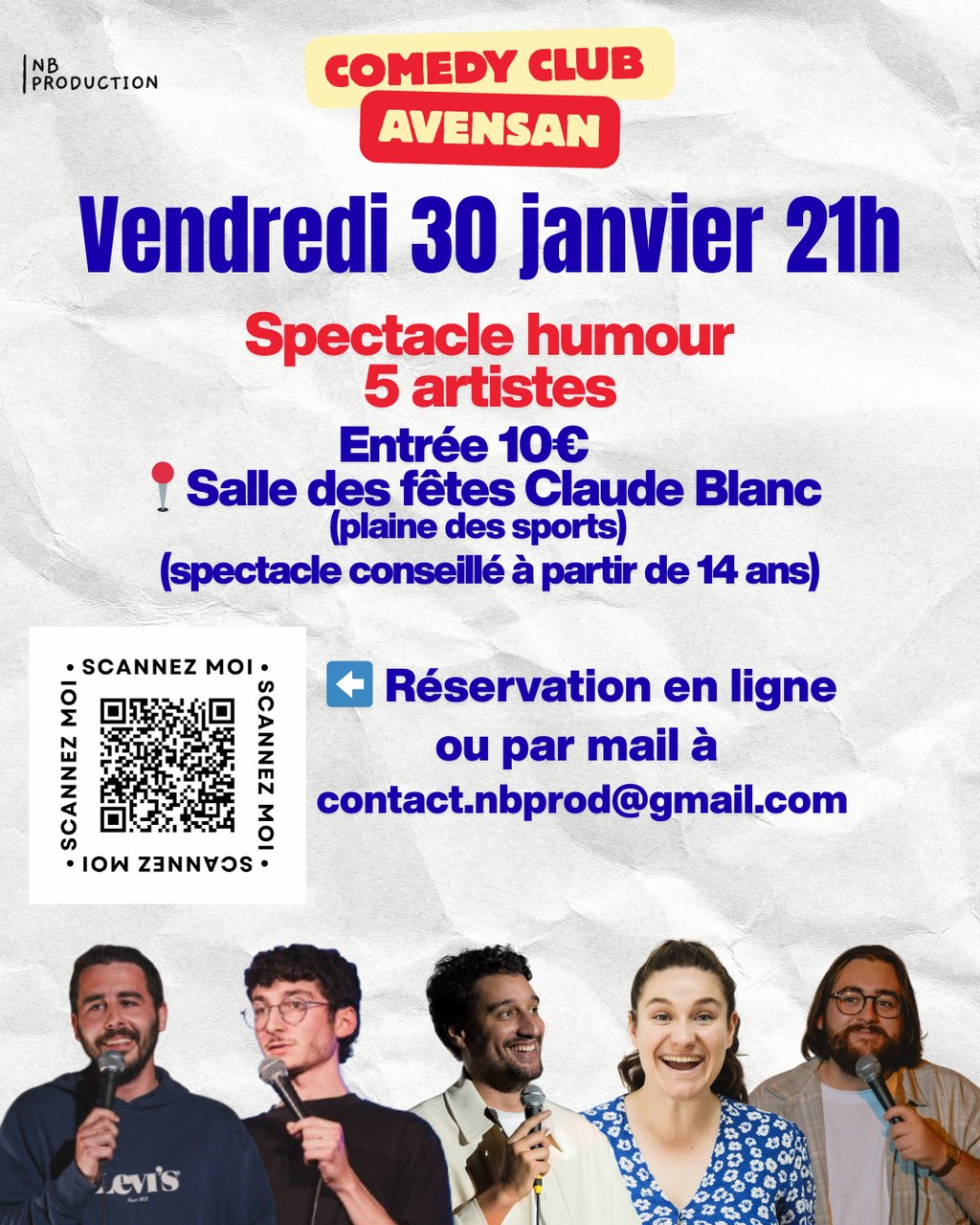 La commune dâAvensan accueille pour la premiĂšre fois son Comedy Club dans la salle des fĂȘtes Claude Blanc organisĂ© par votre association Avensannaise NB PRODUCTION !